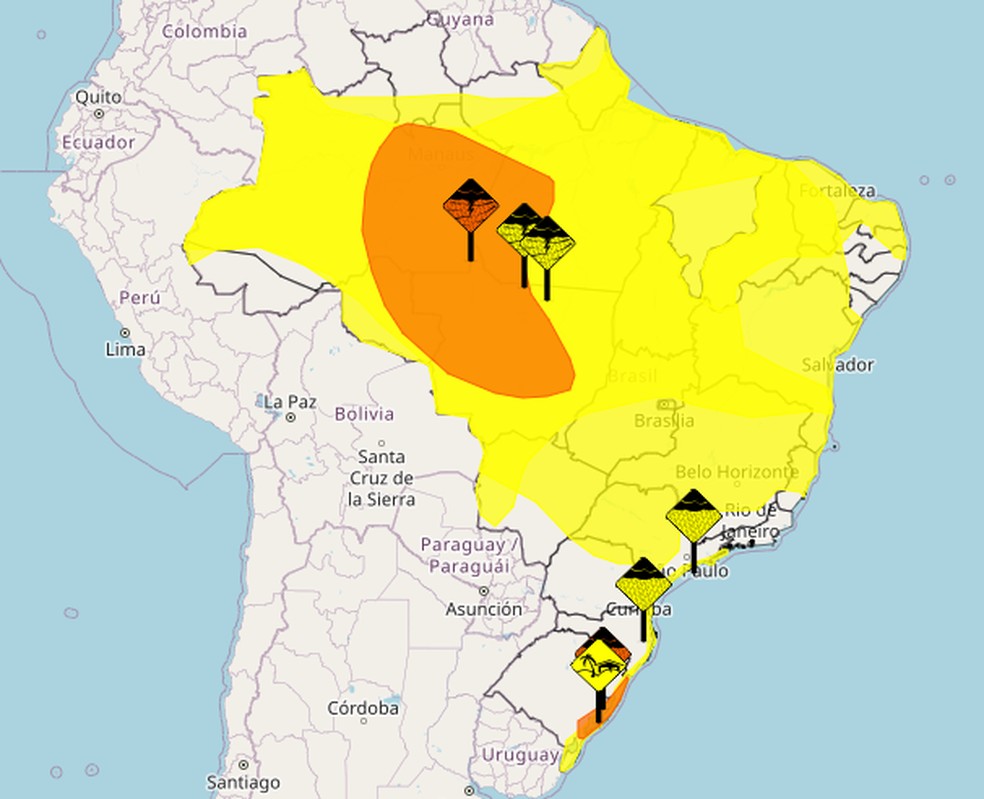 Dois alertas na escala laranja,de "perigo",indicam um acumulado de chuva entre 30 a 60 mm/h ou 50 a 100 mm/dia em todo o litoral do Rio Grande do Sul,algo que não se reproduz no interior do estado,além de chuvas intensas no Mato Grosso,Rondônia,Roraima e Amazonas. O órgão alerta para o risco de alagamentos,deslizamentos de encostas e transbordamentos de rios nas áreas afetadas.
