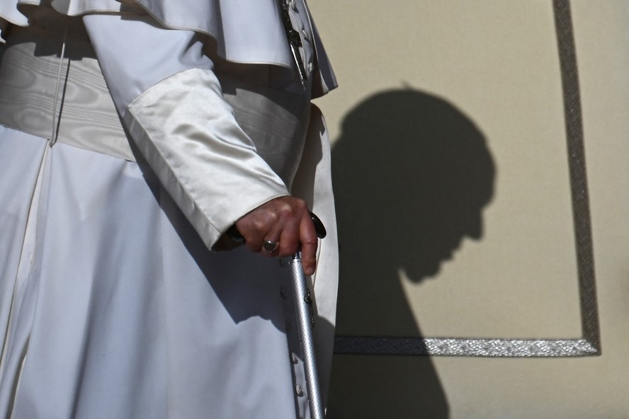 Sombra do Papa Francisco em sua poltrona durante uma audiência geral na Praça de São Pedro — Foto: Filippo Monteforte / AFP