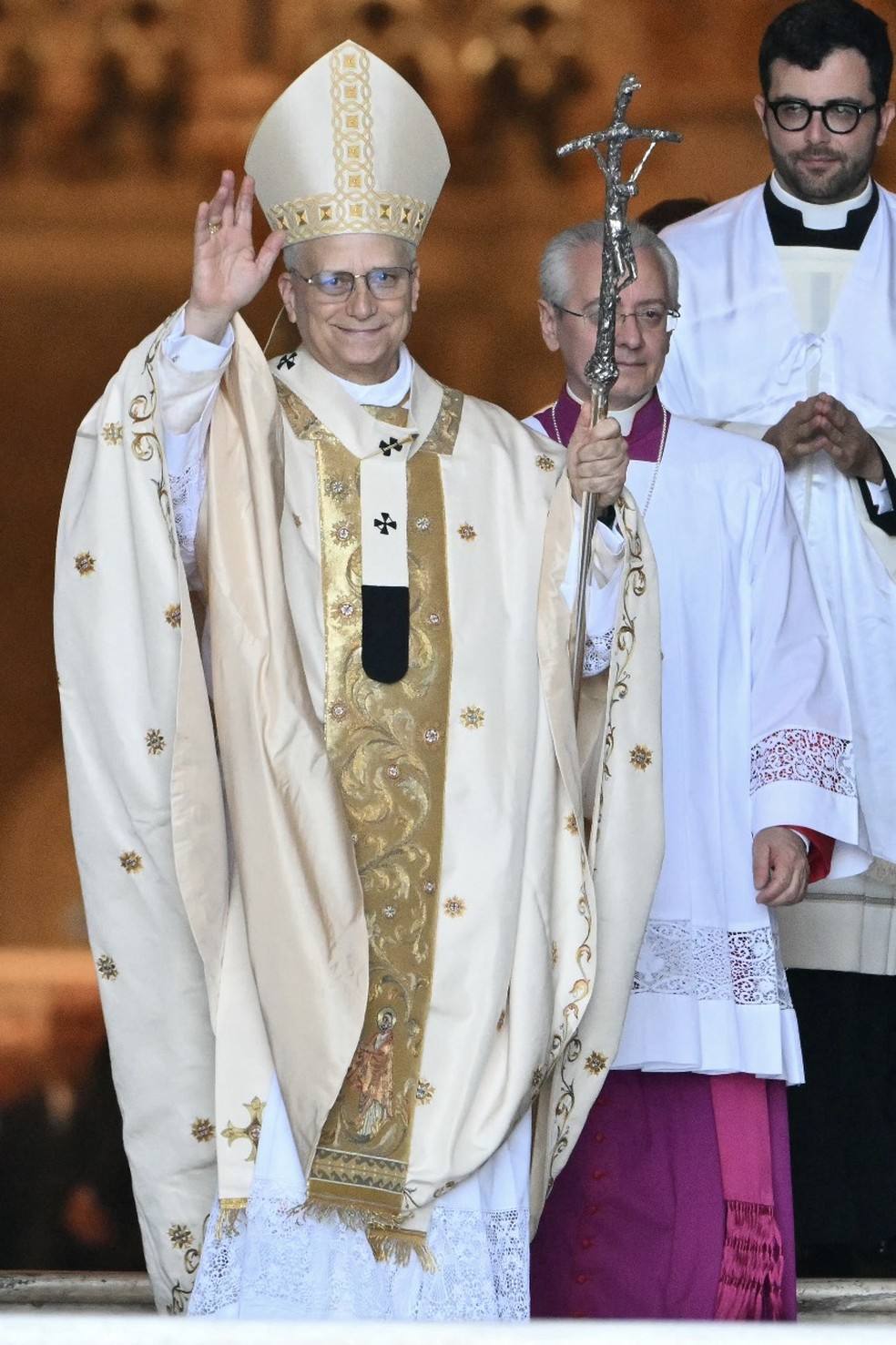 Papa Leão XIV acena para os fiéis que aguardam do lado de fora ao fim de uma missa solene,durante a cerimônia de posse na arquibasílica de São João de Latrão,em Roma,em 25 de maio de 2025 — Foto: Alberto PIZZOLI / AFP
