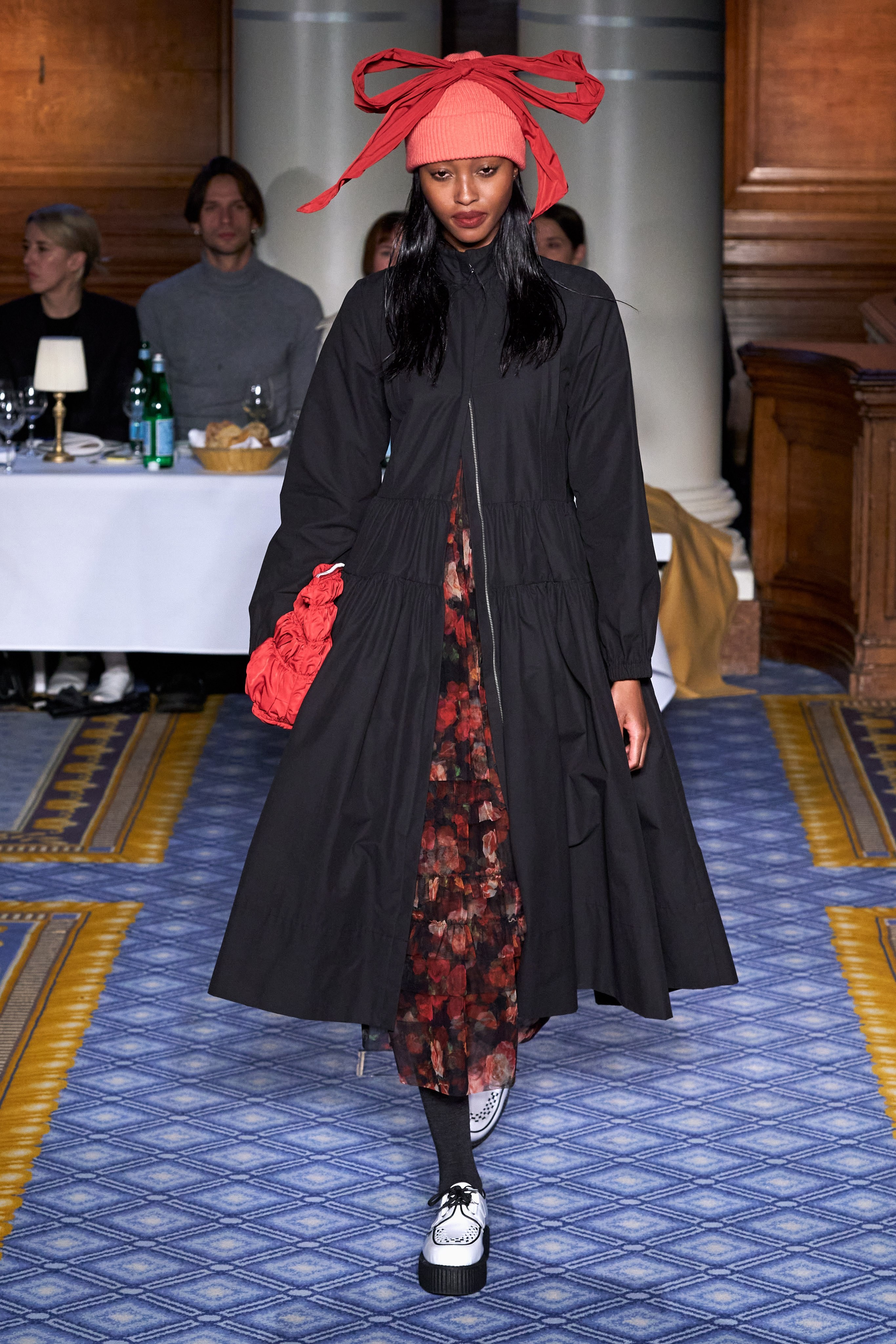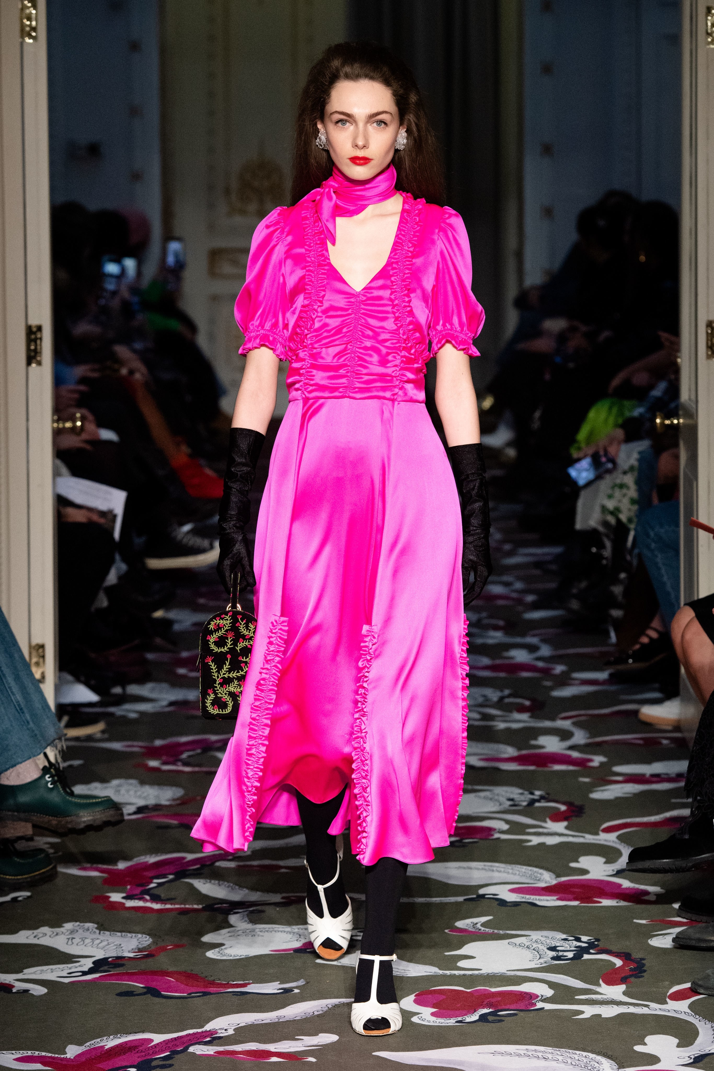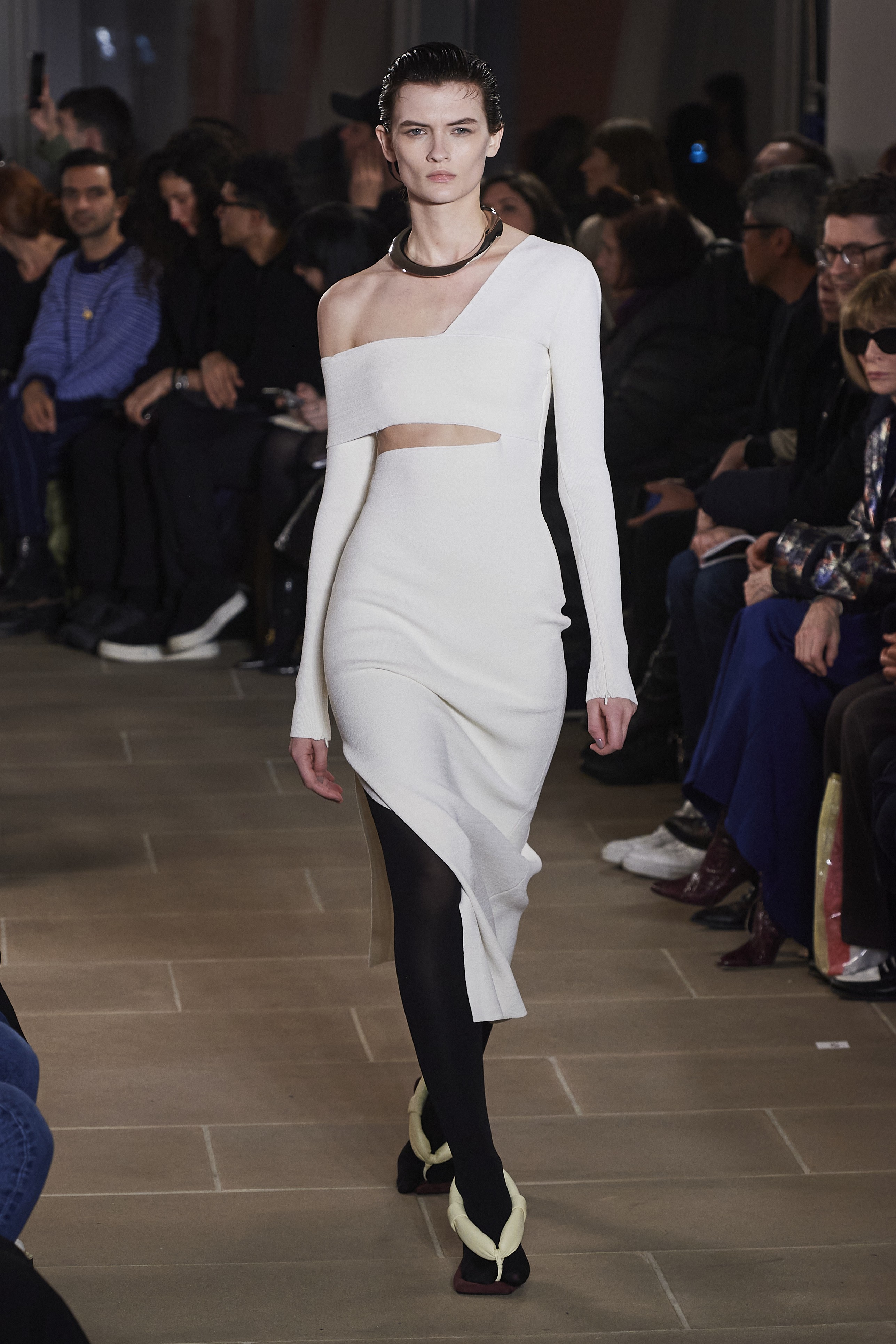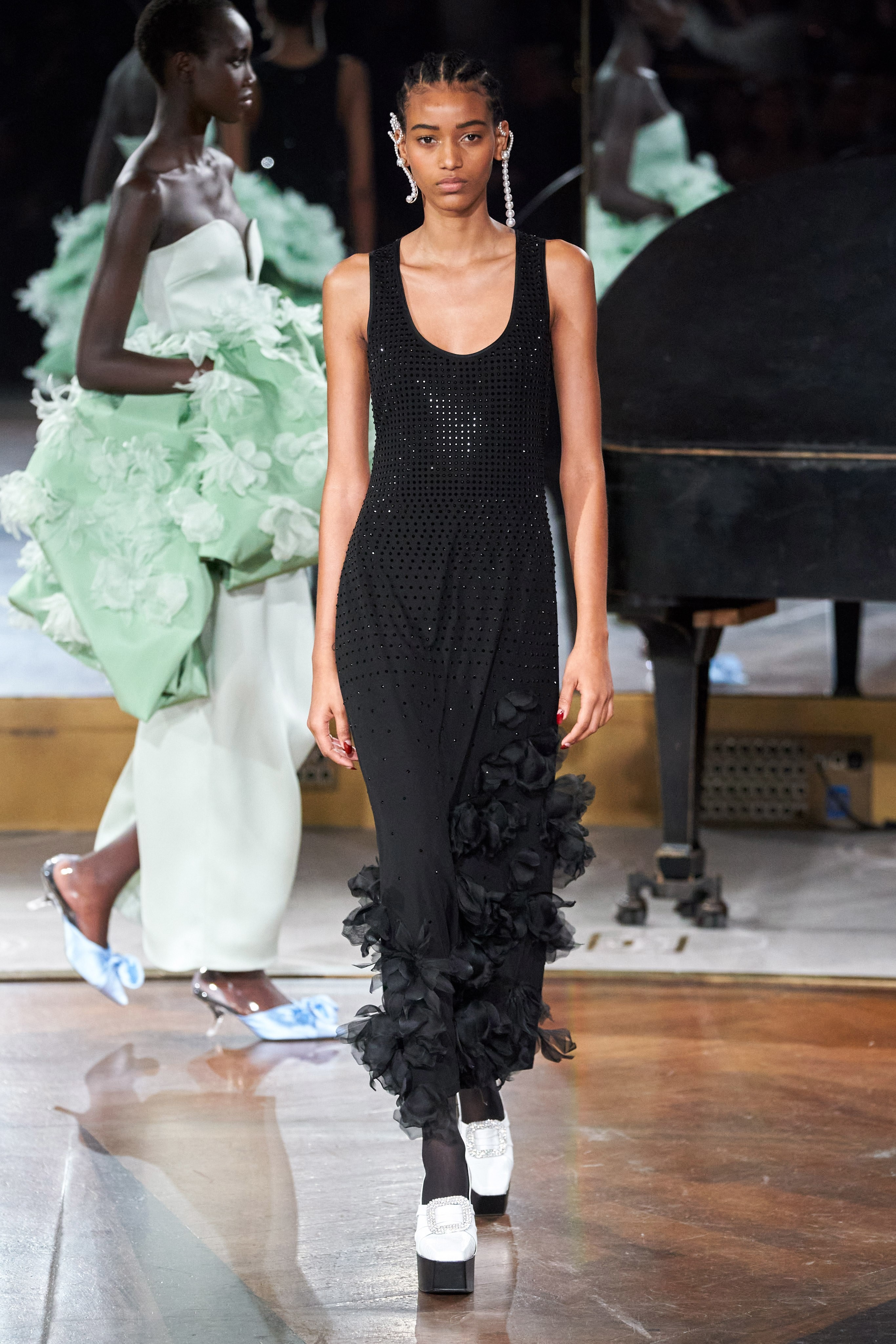 Primeira opção que pode vir em mente, deixe de lado, porém, os sapatos pretos: para a próxima temporada, a meia-calça opaca preta é combinada com sapatos brancos - dos creepers, como na Molly Goddard, aos escarpins de bico quadrado, como na passarela de Rejina Pyo - ambas em Londres.