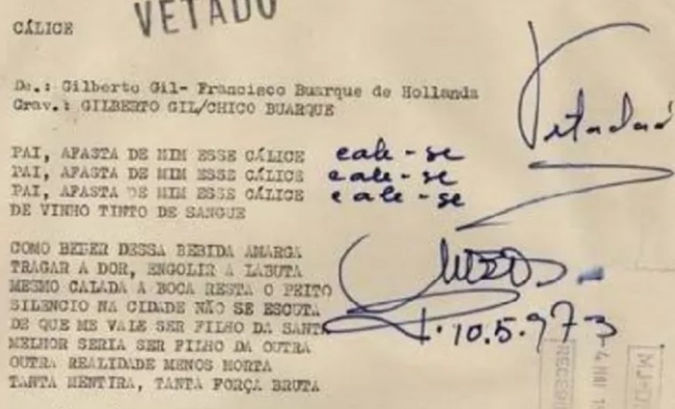 Chico Buarque: A letra de "Cálice" com anotações do veto da censura — Foto: Reprodução
