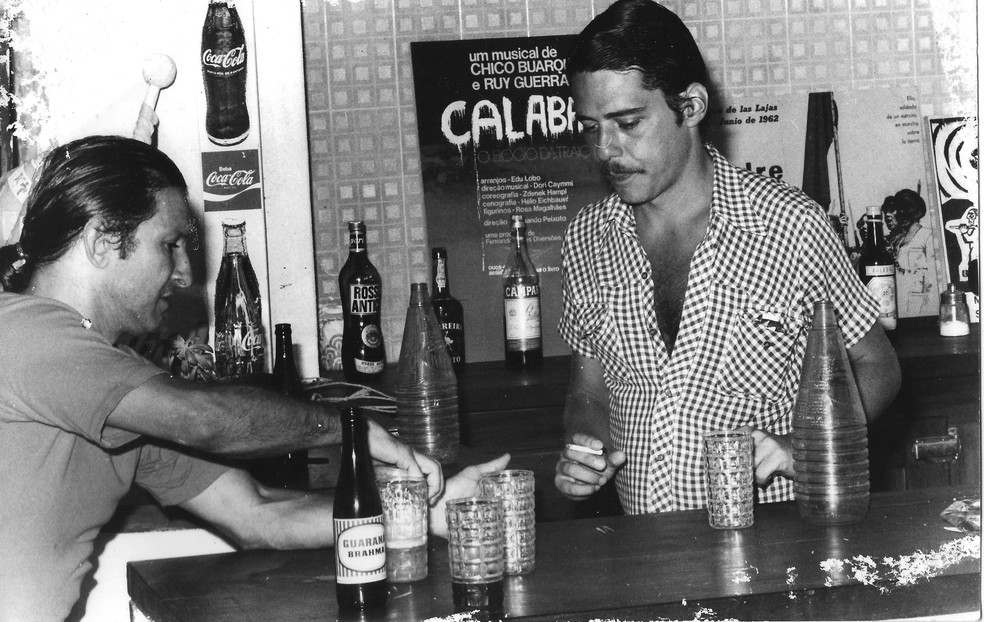 Ruy Guerra (à esquerda) e Chico Buarque,em 1973,com o cartaz de Calabar ao fundo — Foto: Divulgação/Acervo Vavy Borges