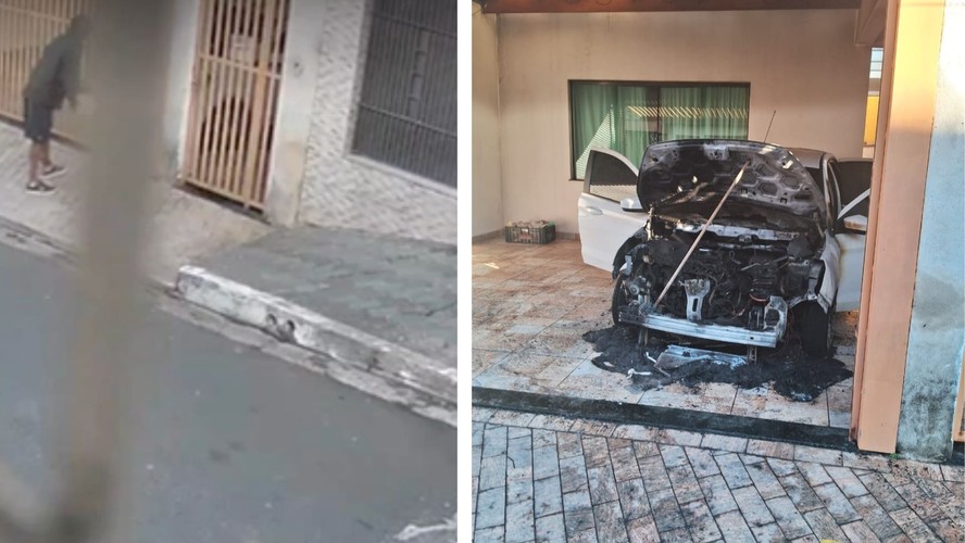 Uma das gravações mostra o momento em que o suspeito,identificado pela polícia como Alex de Mola,se aproxima da garagem da casa com um galão,joga gasolina na parte frontal do carro e na calçada e ateia fogo no líquido. Confira: