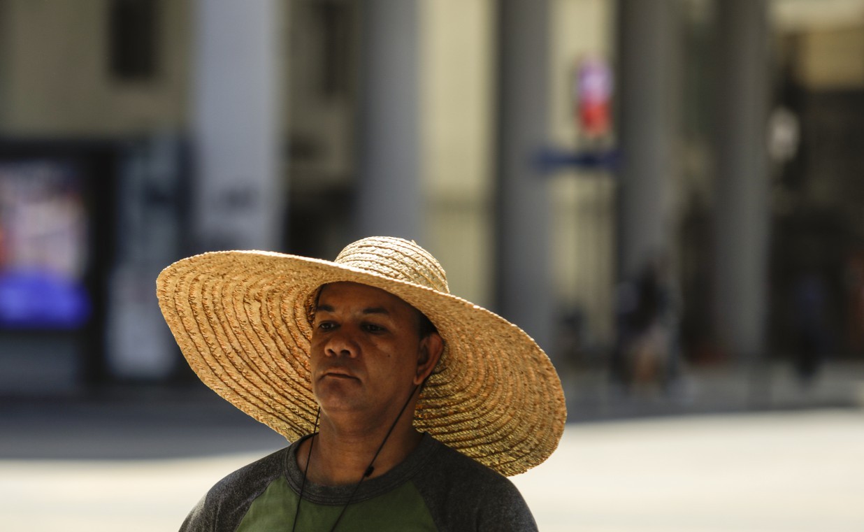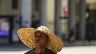 Vendedor ambulante recorre a chapéu para se proteger do sol no Centro do Rio — Foto: Gabriel de Paiva