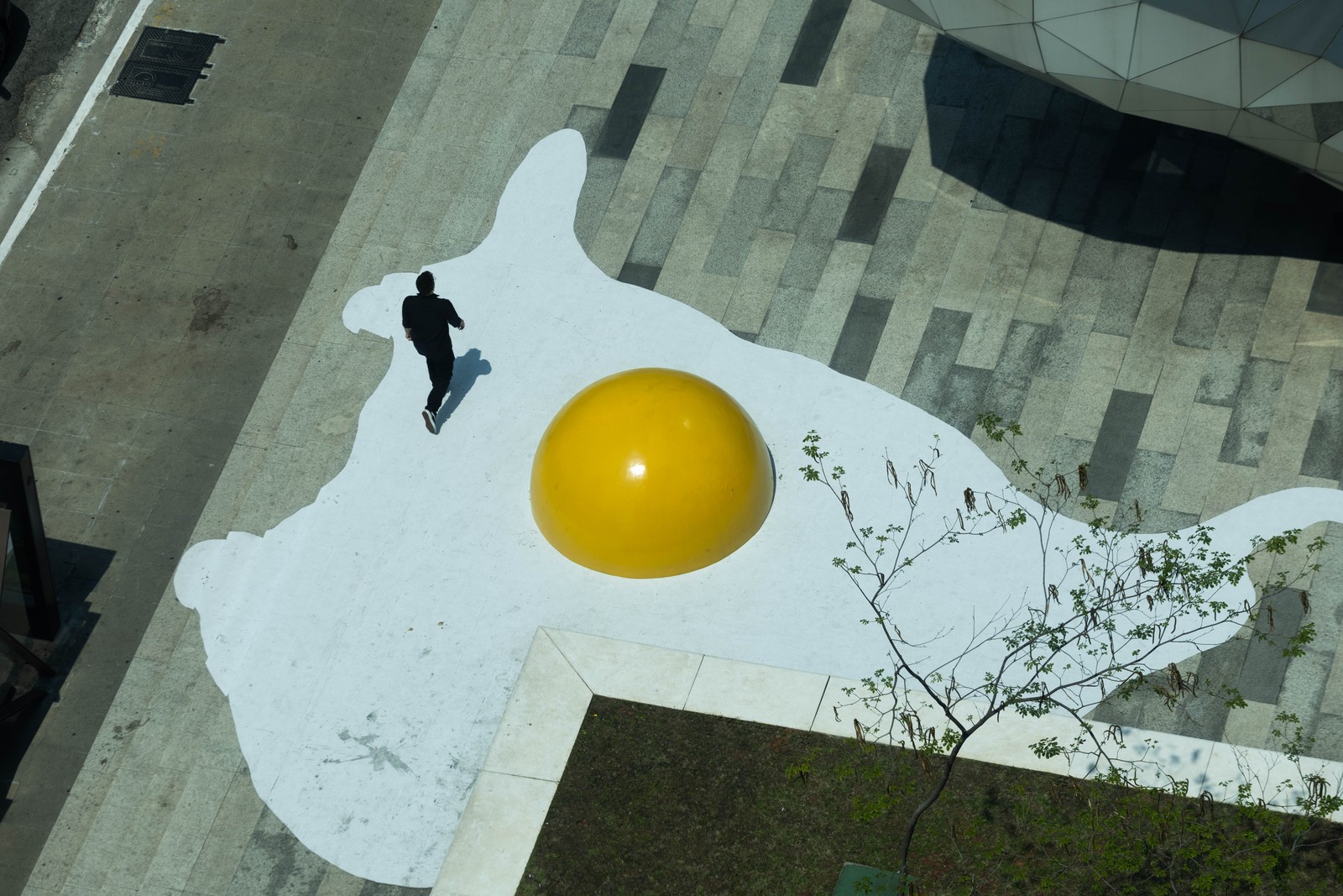 Obra traz três ovos gigantes estalados no chão da Praça do Teatro B32 prontos para serem fritos — Foto: Maria Isabel Oliveira