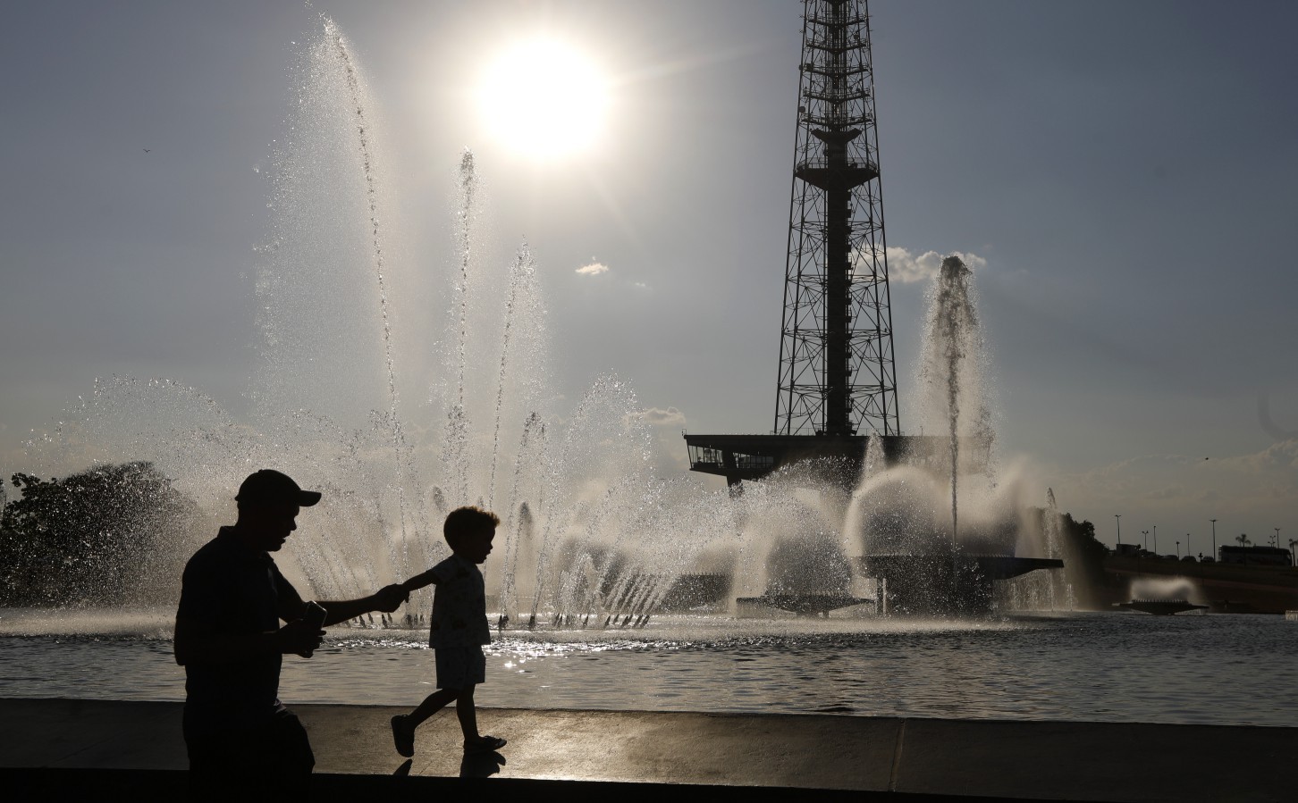 Homem passeia com criança próximo a fonte da Torre de TV,em Brasília,nesta quinta-feira de calor intenso — Foto: Cristiano Mariz / Agência O Globo