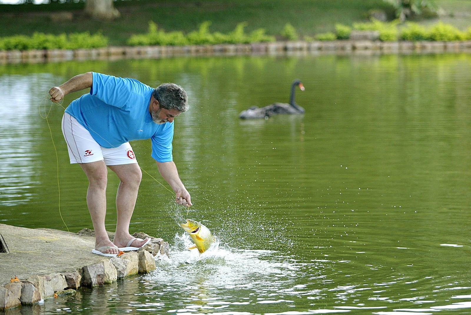 Lula pesca com linhada,no Lago do Palácio da Alvorada,em Brasília. — Foto: Ricardo Stuckert / 13.03.2004
