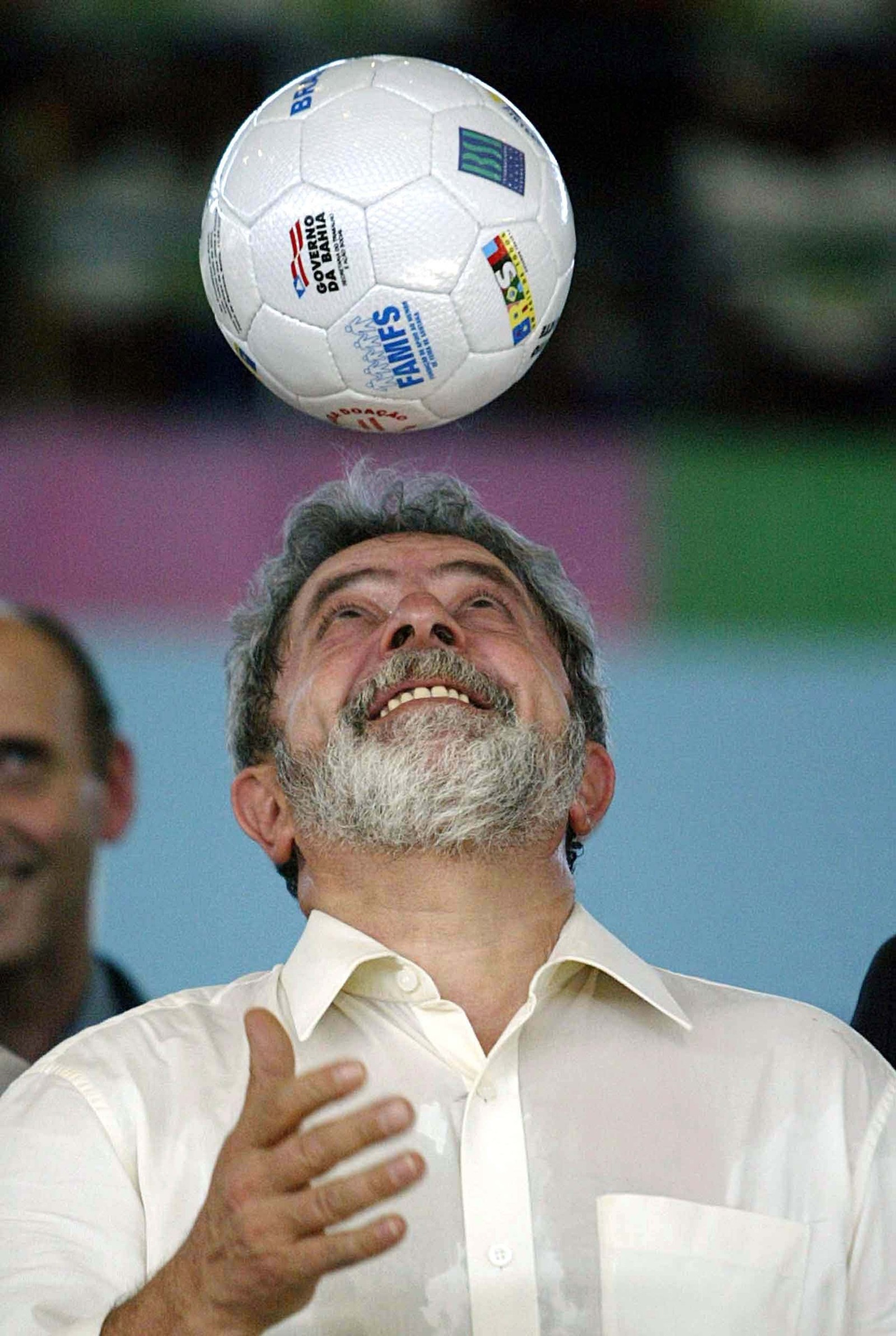 Lula da Silva cabeceia uma bola dada por integrantes do projeto "Pintando a Liberdade",em Feira de Santana,na Bahia. — Foto: Ricardo Stuckert / 12.09.2003