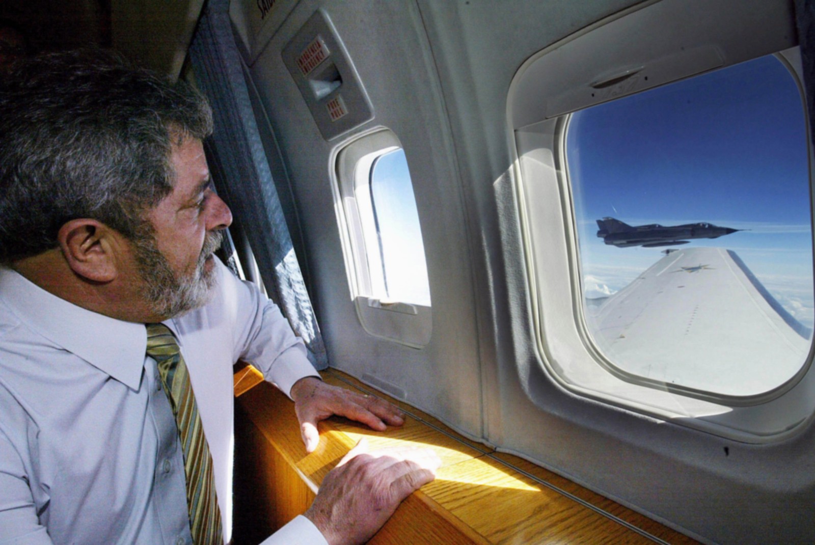 Lula observa caças da FAB que interceptam avião presidencial durante voo. — Foto: RICARDO STUCKERT / 08.04.2003