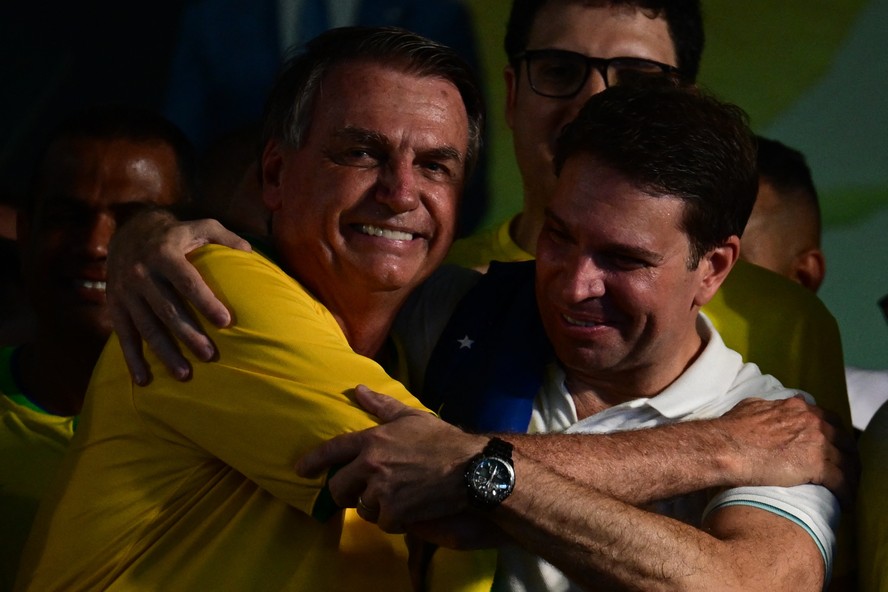 O ex-presidente Jair Bolsonaro abraça seu aliado Alexandre Ramagem,ex-diretor da Abin: PF investiga uso indevido de estrutura do governo — Foto: Pablo Porciuncula/AFP/16-03-2024