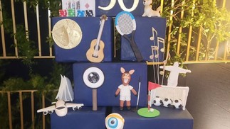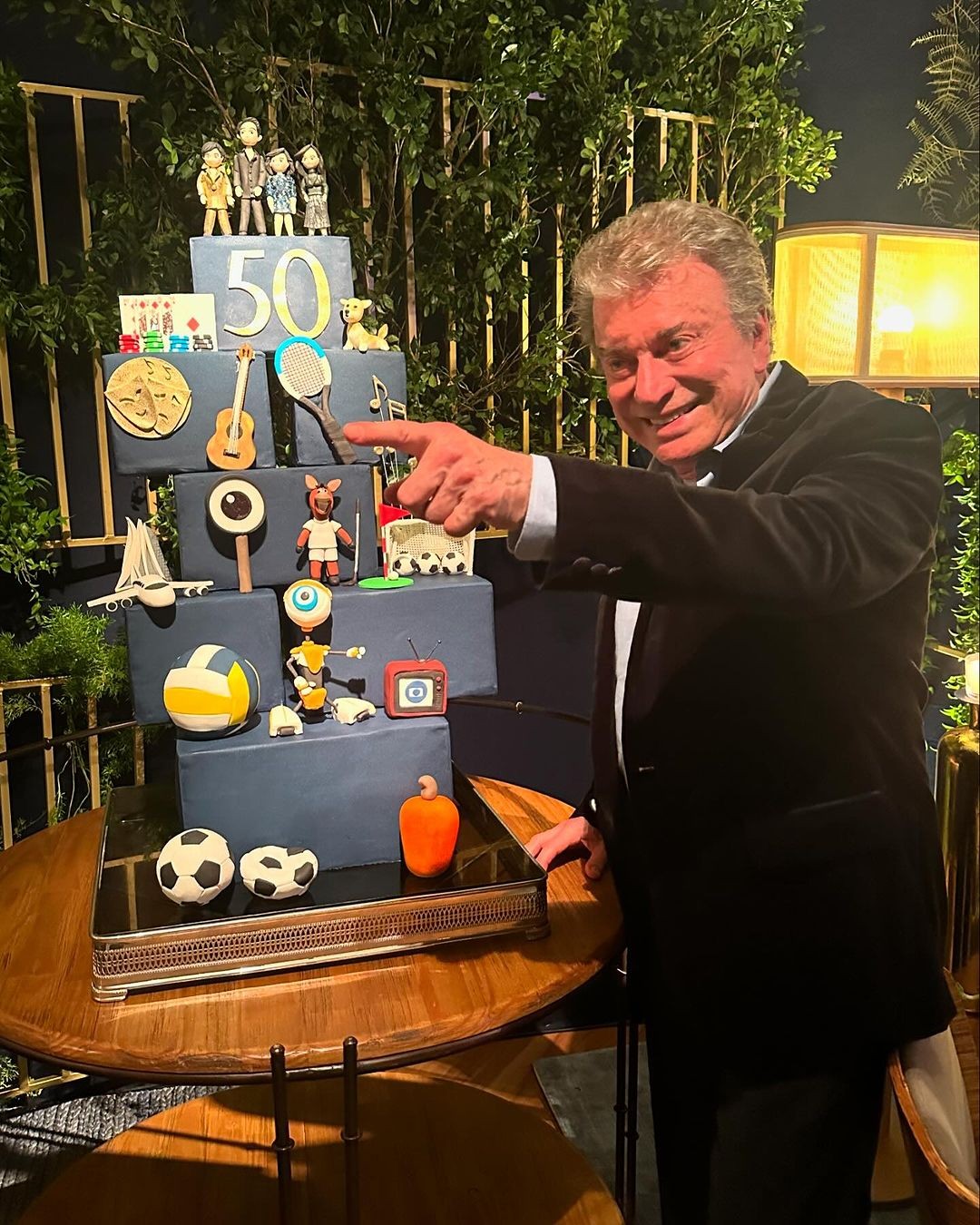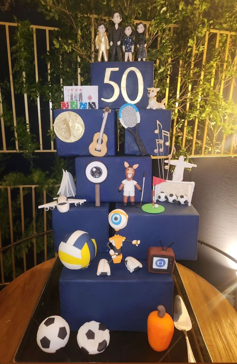 O bolo,com cinco andares,tinha referências à vida pessoal do apresentador e à sua trajetória profissional. Entre os elementos,robôs do “Big Brother Brasil”,os cavalinhos de futebol do “Fantástico” e uma lupa que remetia ao quadro “Detetive virtual”,também do programa dominical. Havia ainda uma bola cheia e uma bola murcha,uma lembrança do quadro de mesmo nome que ele comandou na atração.