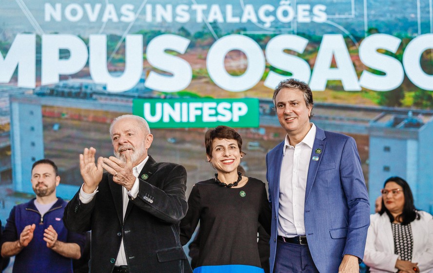 Lula com a reitora da Unifesp,Raiane Assumpção,e o ministro da Educação,Camilo Santana — Foto: Ricardo Stuckert/PR/5-7-2024