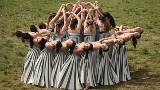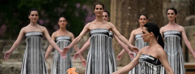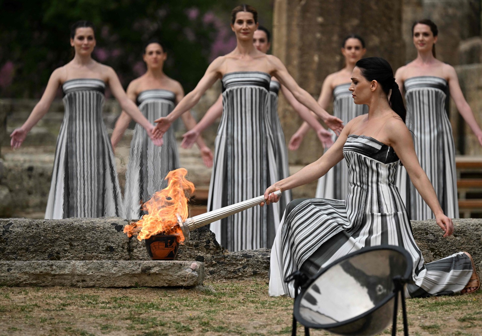 Cerimônia de acendimento da chama olímpica dos Jogos Olímpicos de Paris 2024,no sítio arqueológico da Antiga Olímpia,berço das antigas Olimpíadas no sul da Grécia,em 16 de abril de 2024. — Foto: Angelos Tzortzinis / AFP