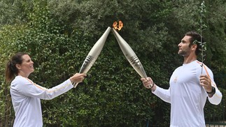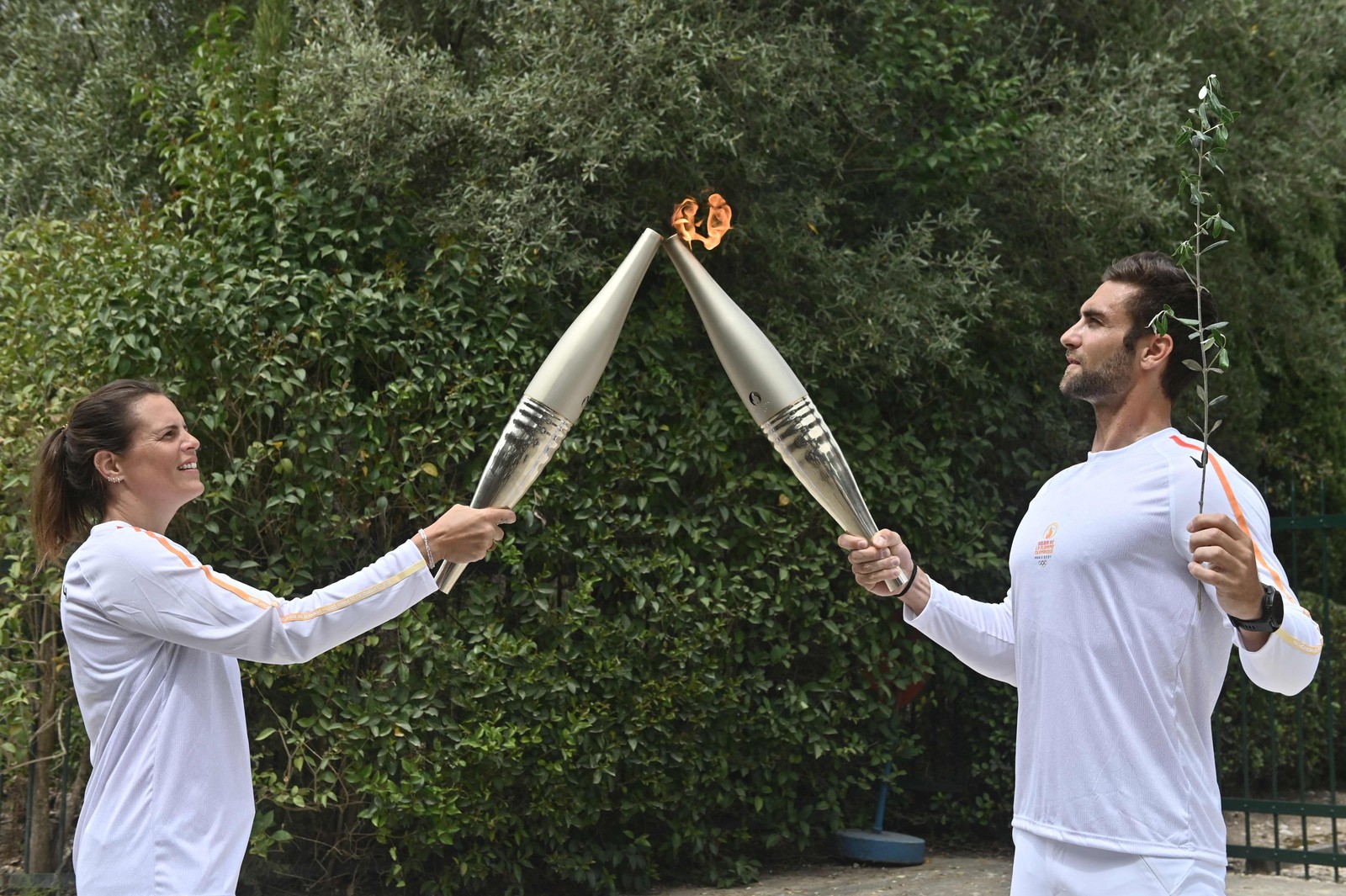 Primeiro portador da tocha,medalhista de ouro olímpico no remo em 2020,Stefanos Ntouskos acende a tocha segurada pela nadadora olímpica francesa,Laure Manaudou,ao iniciar sua corrida com a tocha olímpica após a cerimônia de acendimento da chama para os Jogos Olímpicos Paris 2024 — Foto: Valerie GACHE / AFP