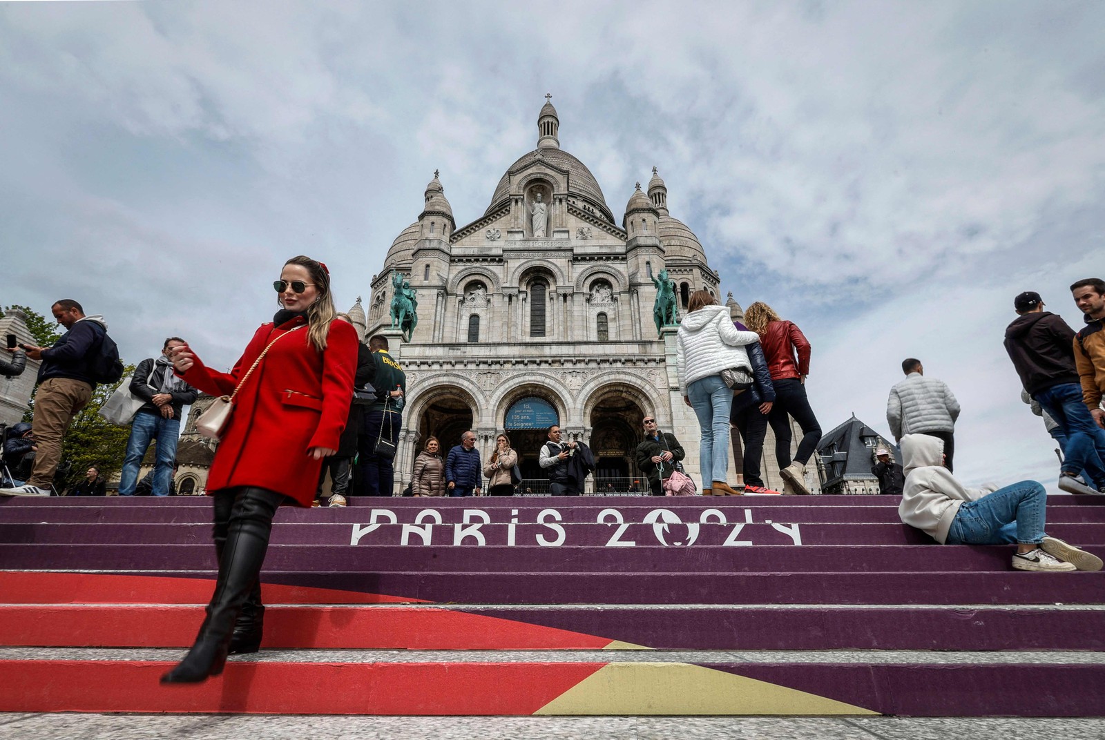 Cidade ganha pinturas temáticas para receber o evento. Na foto,escadaria em frente à Basílica de Sacre Coeur,no topo da colina de Montmartre,em Paris. — Foto: Geoffroy VAN DER HASSELT / AFP