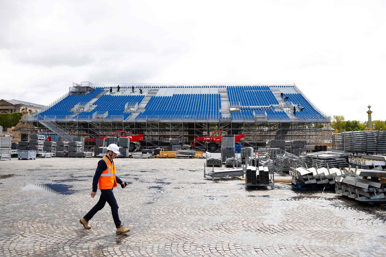 Arquibancadas são construídas no La Concorde Urban Parc para as próximas Olimpíadas de Paris 2024,em Pari. O Parque Urbano sediará eventos de skate de rua,BMX estilo livre e basquete 3×3. — Foto: STRINGER / AFP