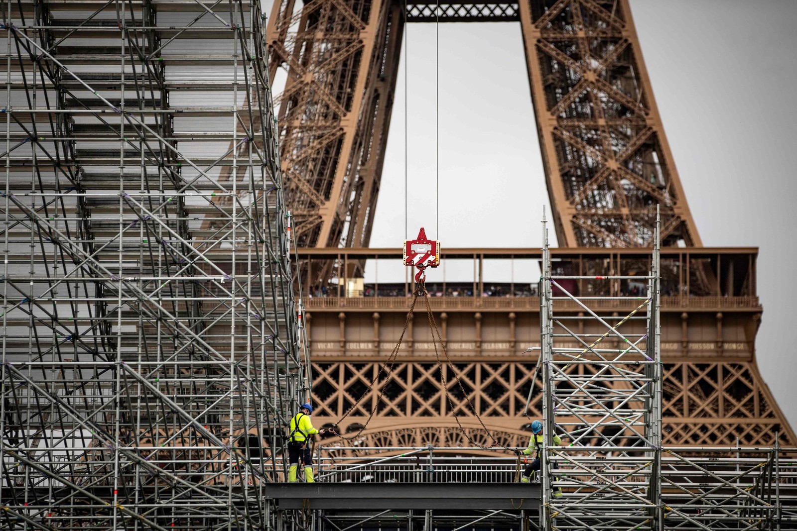 Trabalhadores constroem o Estádio da Torre Eiffel que sediará as competições de vôlei de praia e,nas paraolimpíadas,o futebol masculino para cegos,no jardim do Champ de Mars,em Paris. — Foto: Guillaume BAPTISTE / AFP