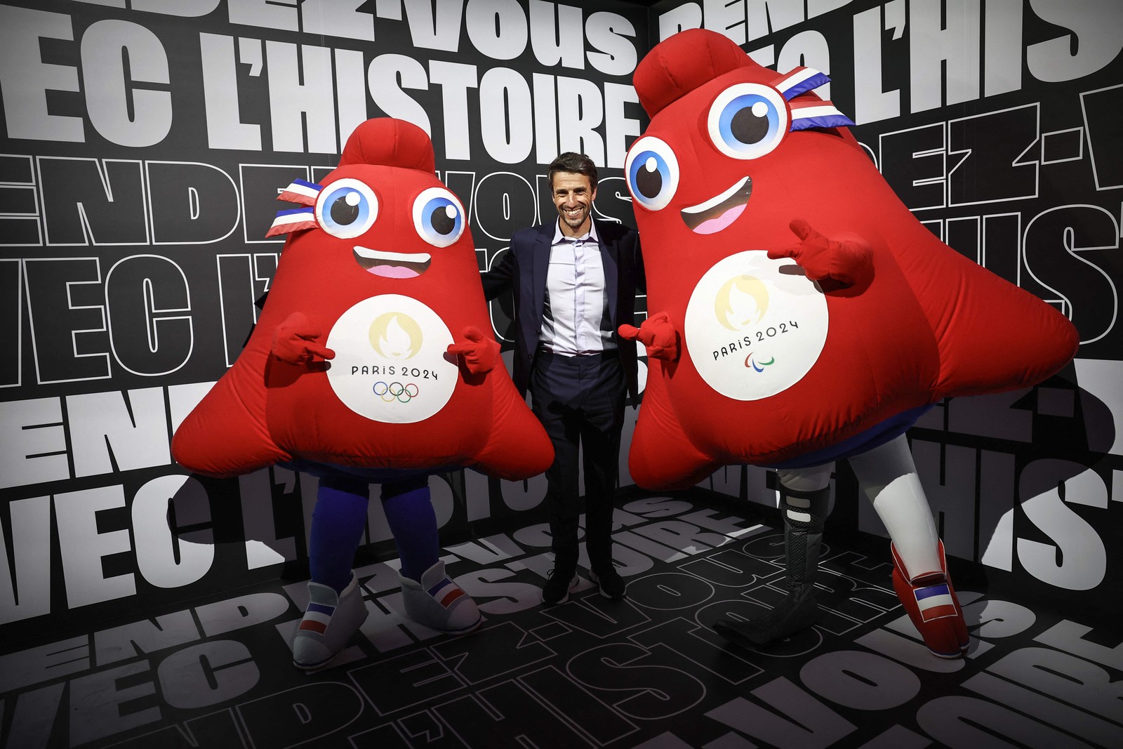 O presidente francês do Comitê Organizador dos Jogos Olímpicos e Paralímpicos de Paris 2024,Tony Estanguet,posa com os mascotes de Paris 2024,"os Phryges". O mascote retrata um chapéu e foi escolhido por ser um grande símbolo de liberdade para os franceses. - Foto: Anne-Christine POUJOULAT / AFP