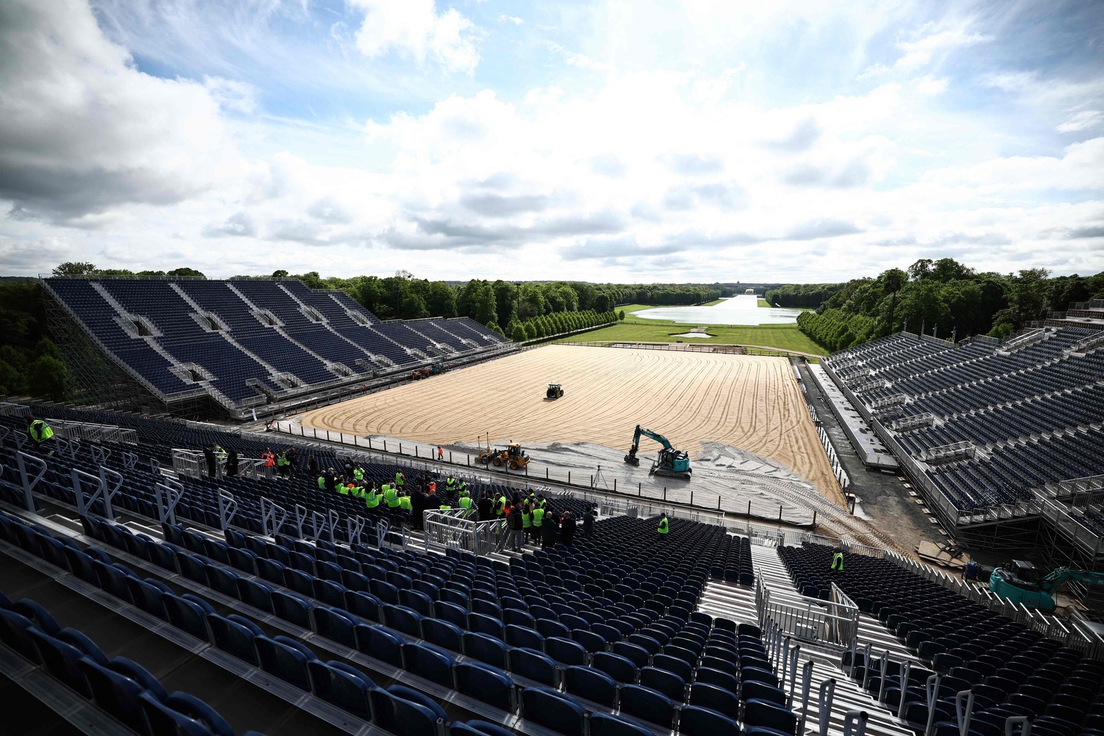 infraestrutura temporária em construção no Palácio de Versalhes que acomodará até 16.300 pessoas para os eventos equestres durante os próximos Jogos Olímpicos e Paralímpicos de Paris 2024. — Foto: Anne-Christine POUJOULAT/AFP