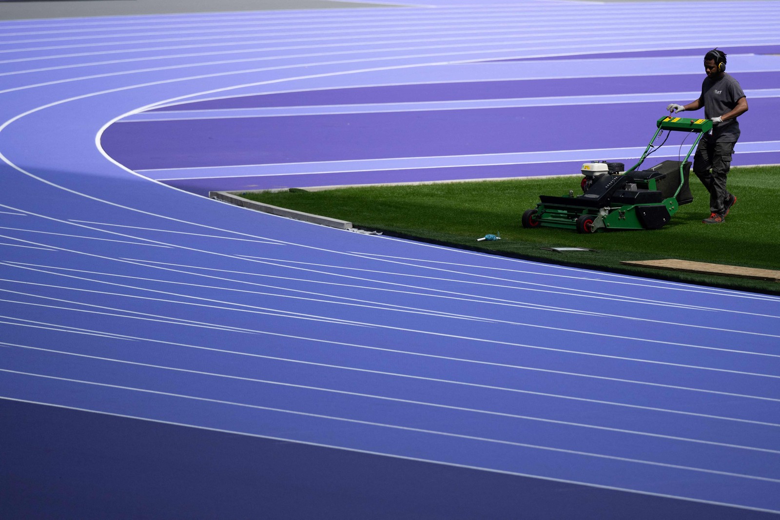 Estádios são restaurados para sediar a Olimpíadas de 2024 em Paris. Na foto,um jardineiro corta a grama do Stade de France,em Saint-Denis — Foto: Martin BUREAU/AFP