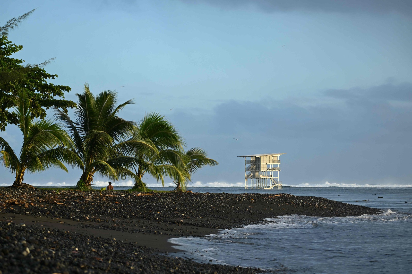 Esta fotografia tirada em 6 de maio de 2024 em Teahupo'o,mostra a torre dos juízes no surf spot de Teahupo'o,na ilha do Taiti,na Polinésia Francesa. Teaupo'o sediará o evento de surf dos Jogos Olímpicos de Paris 2024. — Foto: JEROME BROUILLET/AFP
