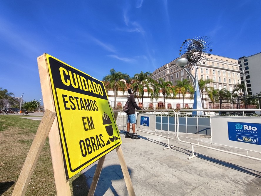 Antônio Balbino observa a pira olímpica no Centro — Foto: Carmélio Dias Cercada por grades,com uma enorme grua ao seu lado e diante de um aviso que informa a realização de obras no local,a pira