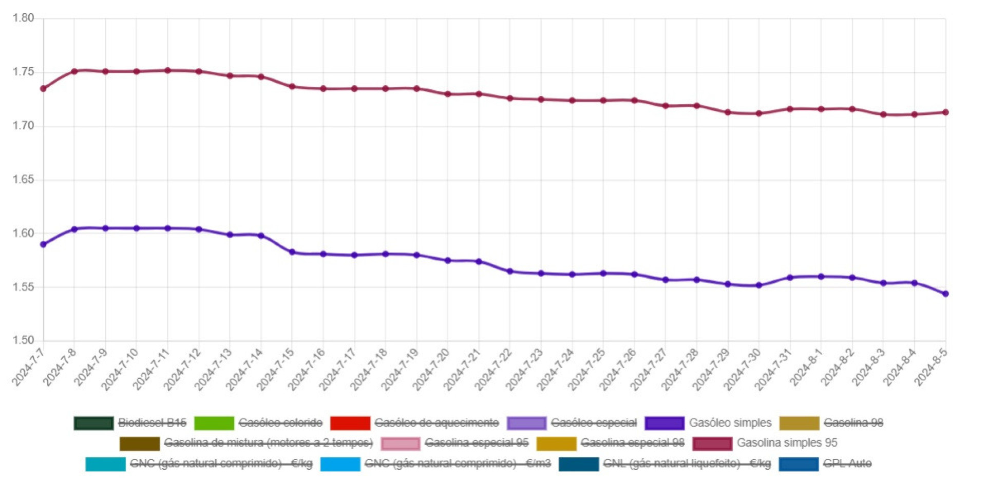Fazendo comparações,pode verificar-se que o preço do gasóleo simples baixou de 1,559 €/litro para 1,544 €/litro entre sexta-feira e segunda-feira,ao passo que o preço da gasolina simples 95 passou de 1,716 €/litro para 1,713 €/litro no mesmo período,de acordo com os preços médios divulgados pela Direção-Geral de Energia e Geologia (DGEG).