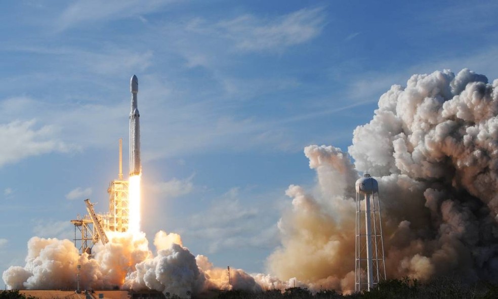 O foguete Falcon 9,da Space X,de Musk,foi lançado da plataforma 39A,do Kennedy Space Center,de onde também partiram lançamentos históricos como os das missões do programa Apollo e dos ônibus espaciais — Foto: JIM WATSON / AFP