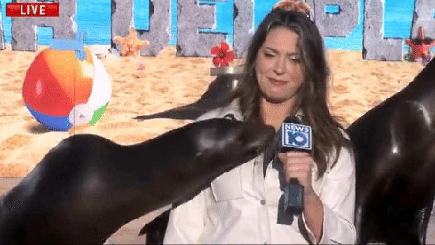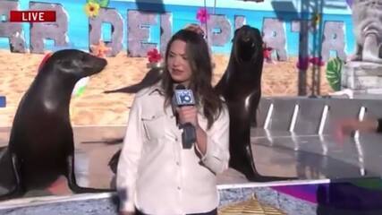Repórter é interrompida por 'beijos' de leões marinhos em reportagem ao vivo,nos EUA