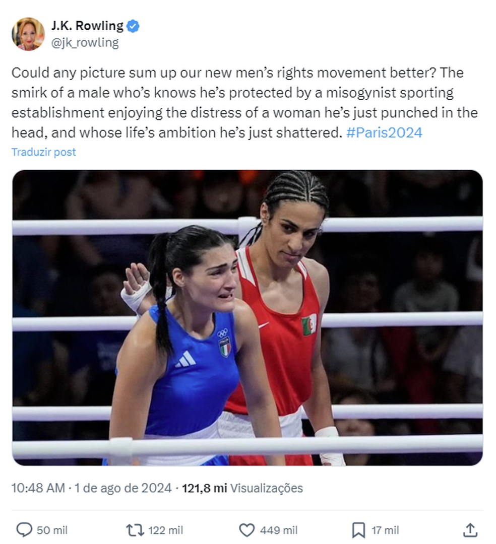 Há anos,a criadora de "Harry Potter" participa de uma campanha contra os direitos de pessoas transexuais. “Me recuso a me curvar diante de um movimento que,na minha opinião,está causando um dano demonstrável ao tentar erodir a ‘mulher’ como classe política e biológica”,afirmou há algum tempo a escritora sobre o ativismo trans. Durante os Jogos Olímpicos,ela publicou e repostou dezenas de postagens sobre o “caso Khelif”. A boxeadora,no entanto,é biologicamente uma mulher — e não um homem,como foi acusada.
