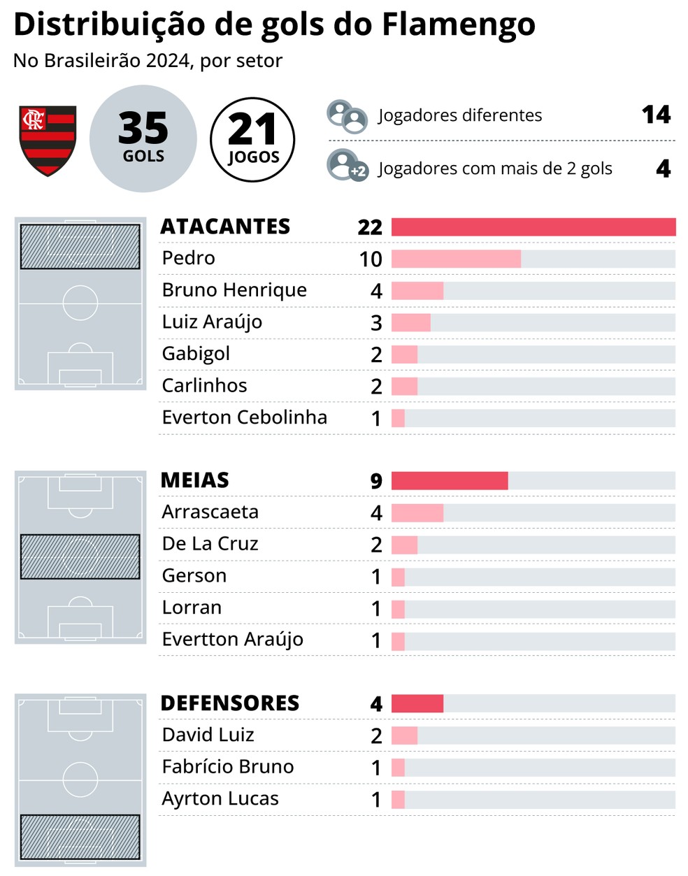 Distribuição de gols do Flamengo no Brasileirão 2024 — Foto: Editoria de Arte