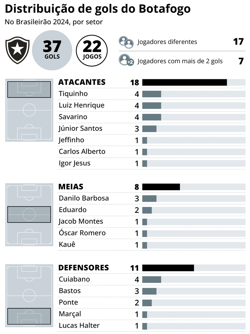 Distribuição de gols do Botafogo no Brasileirão 2024 — Foto: Editoria de Arte