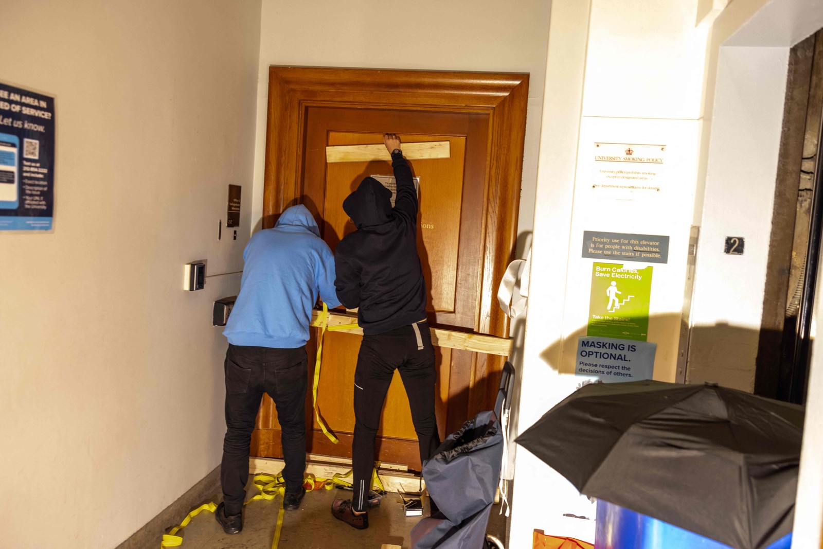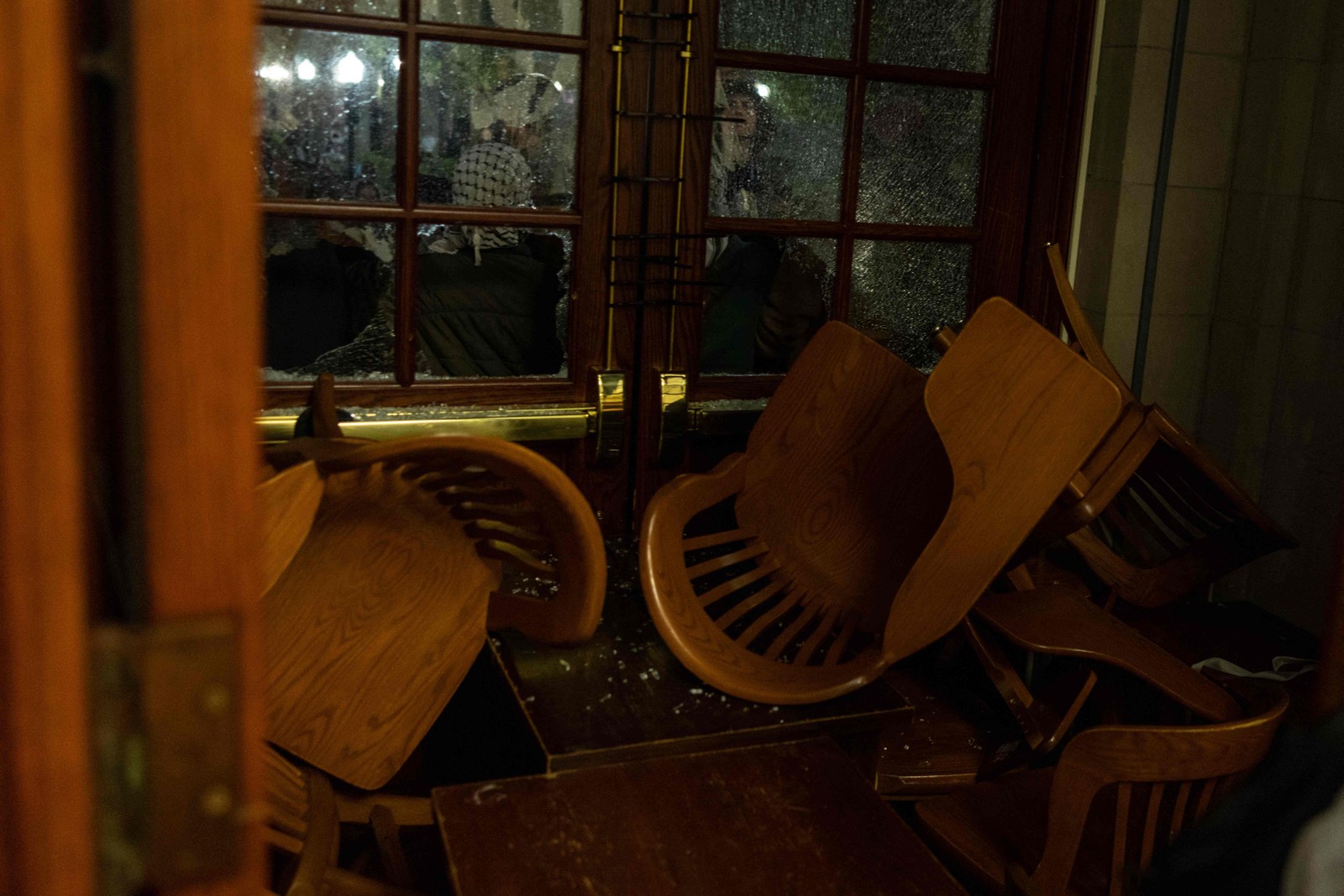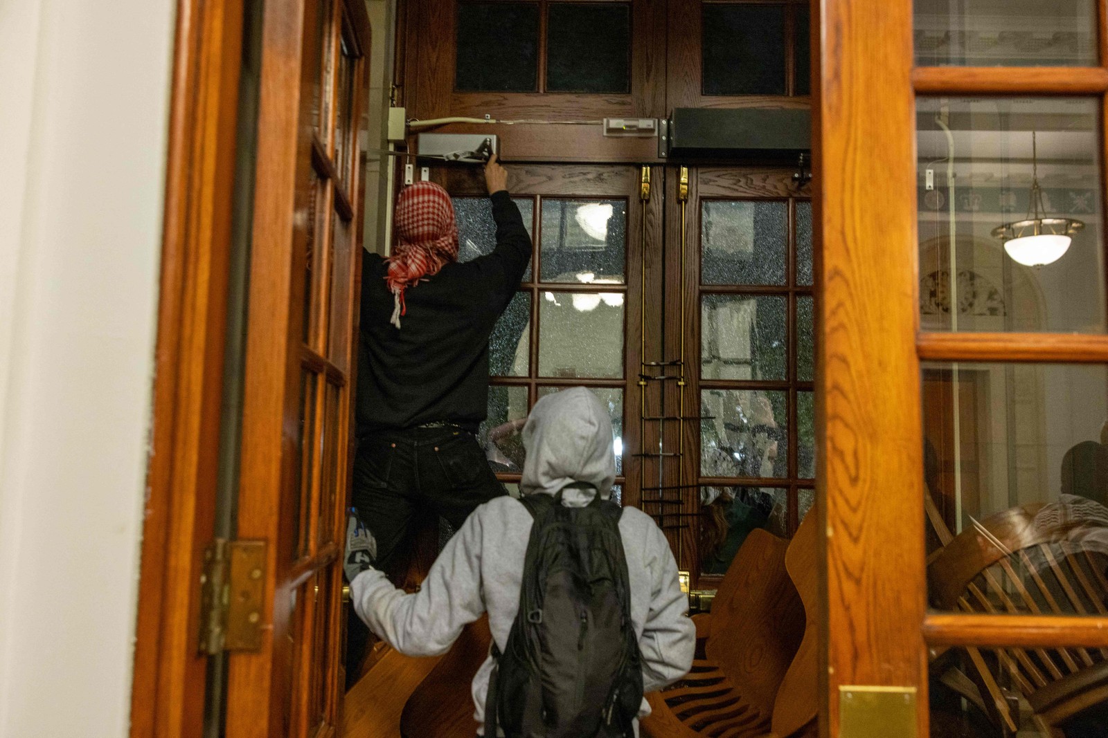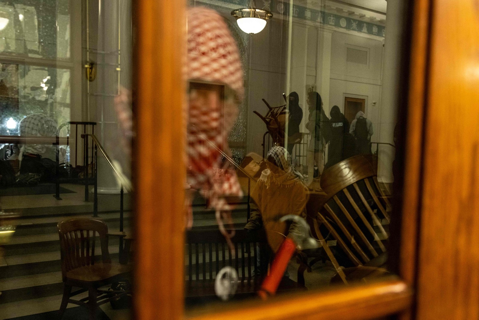 Manifestantes que apoiam os palestinos em Gaza barricam-se dentro do Hamilton Hall,onde o escritório do Reitor está localizado — Foto: Alex Kent/Getty Images/AFP