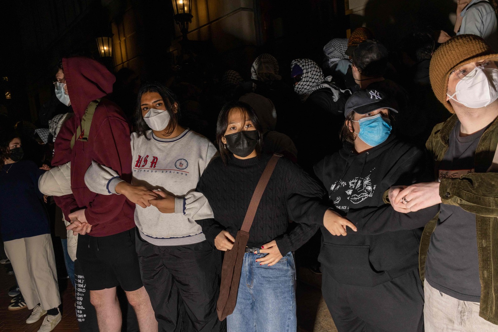 Estudantes/manifestantes cruzam os braços para proteger autoridades em potencial contra o alcance de colegas manifestantes que se barricaram dentro do Hamilton Hall,— Foto: Alex Kent/Getty Images/AFP