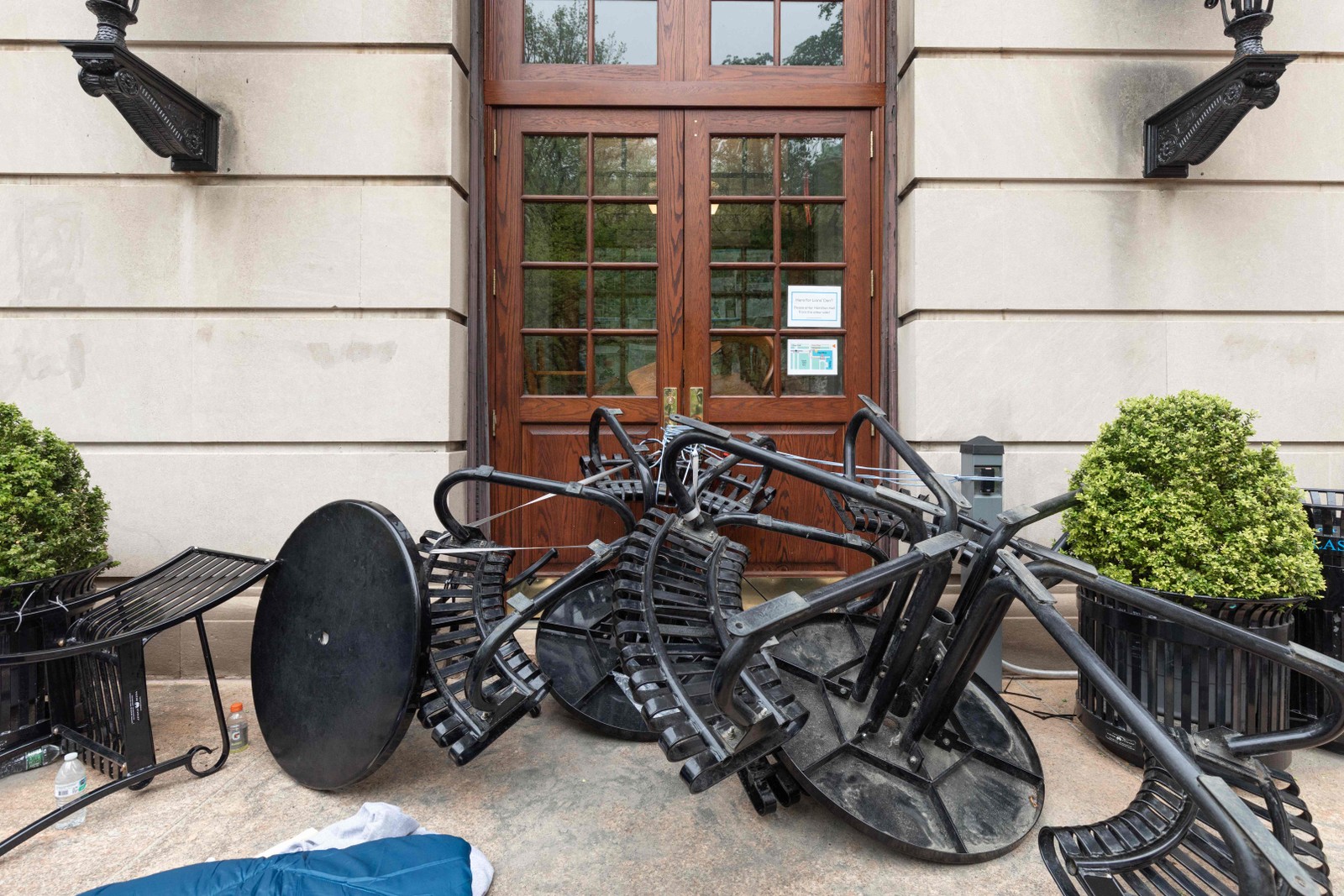 Cadeiras,mesas e barricadas são usadas para bloquear as portas enquanto manifestantes do acampamento pró-Palestina no Campus de Columbia se barricam dentro do Hamilton Hall,onde o escritório do Reitor está localizado — Foto: Alex Kent/Getty Images/AFP