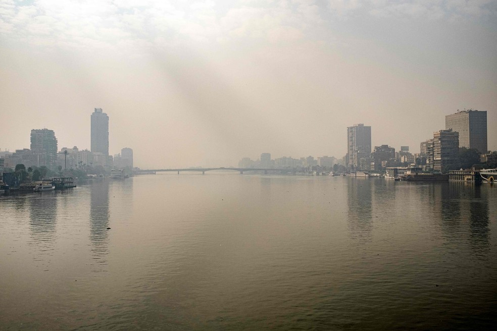 Vista do rio Nilo entre a capital do Egito,Cairo (esquerda),e Gizé (direita),encoberta pela poluição do ar — Foto: Amir Makar/AFP