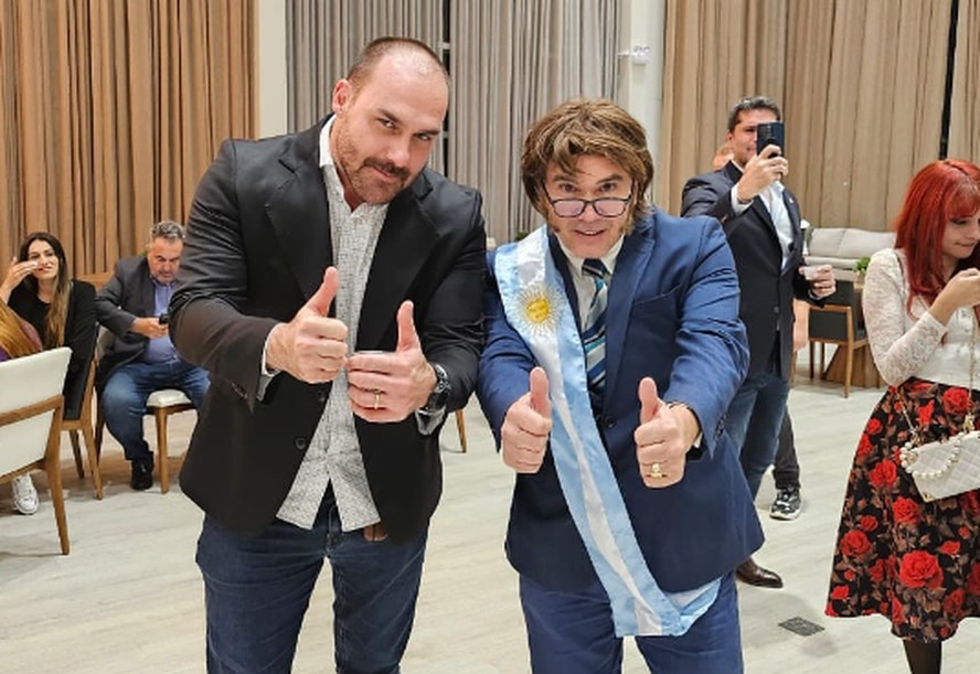 Candidato Milei de Floripa e senador Flávio Bolsonaro — Foto: Reprodução/Redes