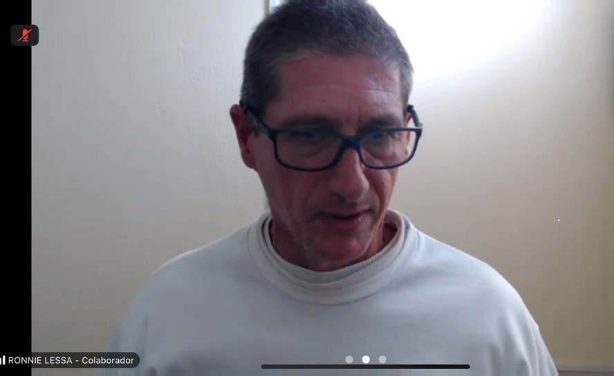 O réu colaborador Ronnie Lessa depõe na audiência do STF — Foto: Reprodução RESUMOSem tempo? Ferramenta de IA resume para você