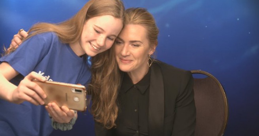 Kate Winslet com a jornalista alemã a quem a atriz encorajou durante entrevista — Foto: Reprodução
