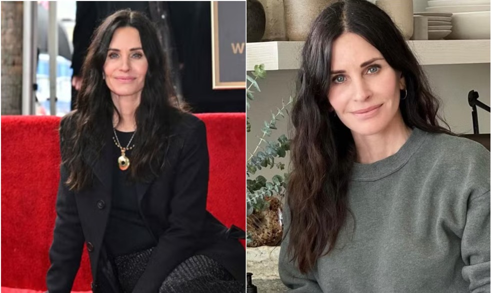 Courteney Cox antes e depois de desfazer uma harmonização facial — Foto: AFP/ Reprodução/ Instagram
