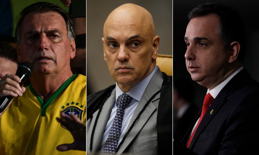 Da esquerda para a direita: o ex-presidente Jair Bolsonaro (PL),o ministro do Supremo Tribunal Federal (STF) Alexandre de Moraes e o presidente do Senado,Rodrigo Pacheco (PSD-MG) — Foto: Fotos de Pablo Porciúncula/AFP,Brenno Carvalho/O Globo e Cristiano Mariz/O Globo