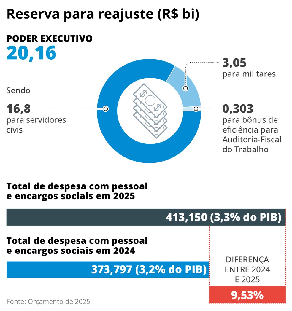 Em 2024,reajustes e reestruturações de carreiras acordadas com os servidores do governo federal,aprovadas ou em negociações,contemplaram 98,2% do pessoal do Executivo,segundo o Ministério da Gestão e Inovação em Serviços Públicos (MGI). Com os acordos firmados neste ano,o governo prevê impacto orçamentário de R$ 16,8 bilhões para 2025. Em 2026,a previsão é de R$ 11 bilhões.