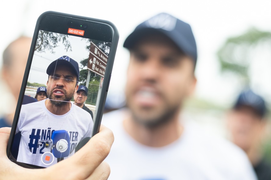 Pablo Marçal filmado por integrantes de sua equipe durante evento de campanha em São Paulo — Foto: Maria Isabel Oliveira