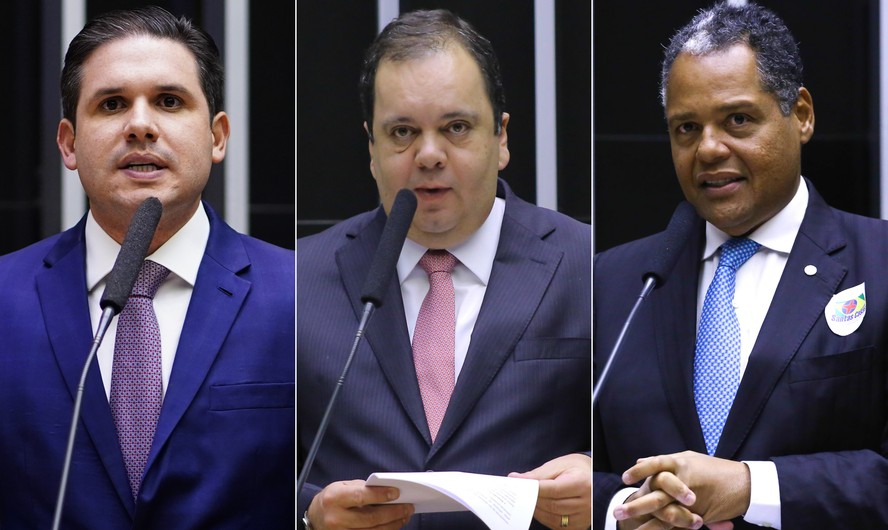 Os deputados Hugo Motta (Republicanos-PB),Elmar Nascimento (União-BA) e Antonio Brito (PSD-BA): corrida pela sucessão de Arthur Lira — Foto: Fotos de Pablo Valadares,Michel Jesus e Vinicius Loures