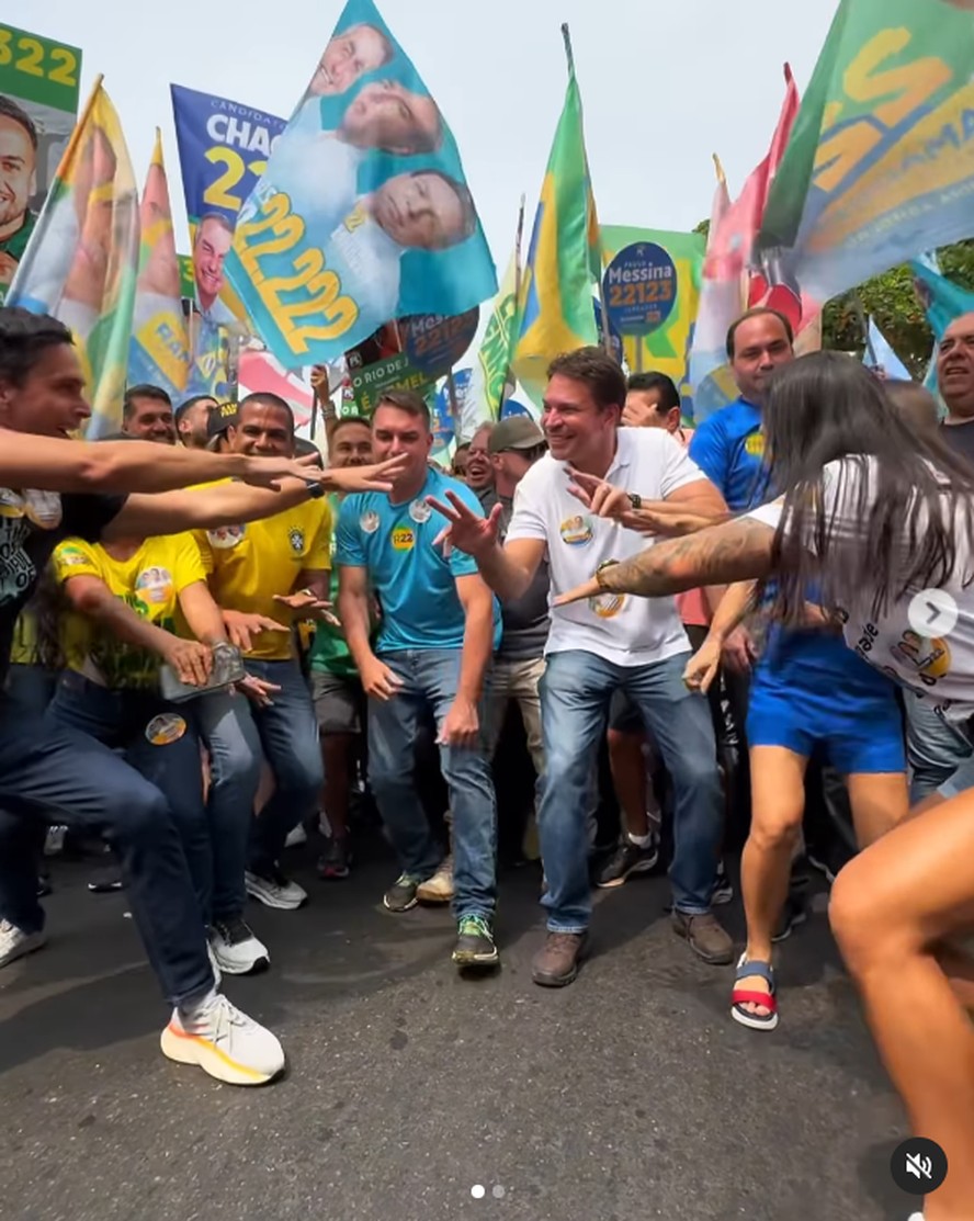 O candidato a prefeito do Rio Alexandre Ramagem (PL) protagonizou um momento descontraído com aliados durante a caminhada deste domingo na Praia de Copacabana,Zona Sul do Rio. Delegado da Polícia Federal,ele dançou o funk que é jingle de sua campanha ao lado da mulher,Rebeca Ramagem,e de aliados sua vice,Índia Armelau (PL),o senador Flávio Bolsonaro (PL) e o deputado federal Luiz Lima (PL).