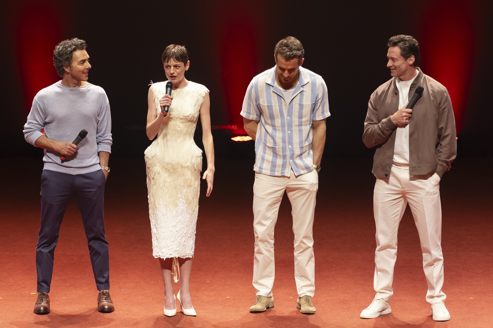 Shawn Levy,Emma Corrin,Ryan Reynolds e Hugh Jackman na Cidade das Artes,no Rio,para evento de "Deadpool & Wolverine" — Foto: Leo Martins / Agencia O Globo