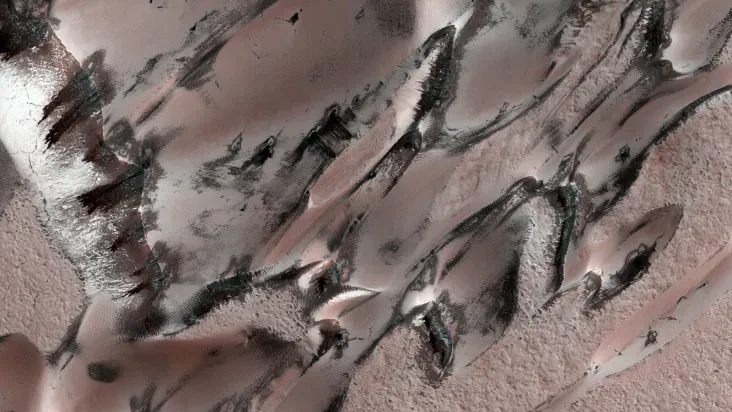 Imagem mostra um campo de dunas polares único durante a primavera do Norte,revelando alguns padrões interessantes — Foto: Crédito: NASA/JPL-Caltech/University of Arizona