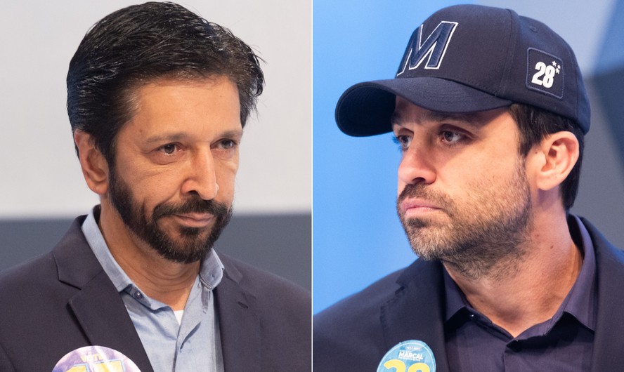 O prefeito de São Paulo e candidato à reeleição,Ricardo Nunes (MDB),e o rival Pablo Marçal (PRTB): disputa pelo eleitorado bolsonarista — Foto: Fotos de Maria Isabel Oliveira/O Globo