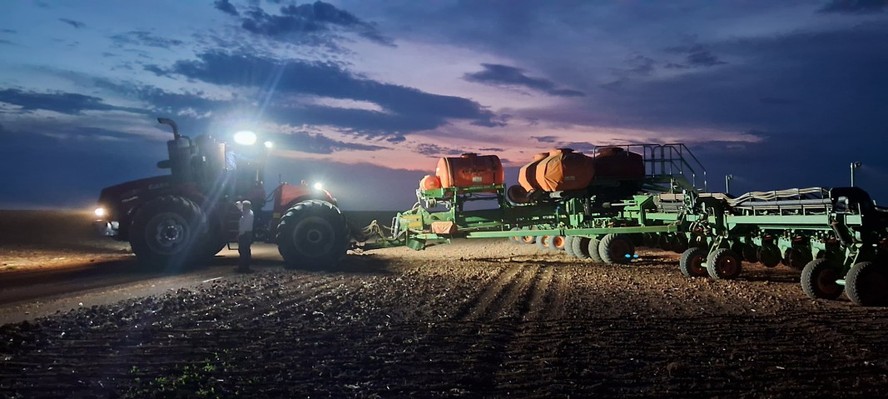 Plantadeira trabalha durante a noite em Rio Verde,em Goiás: setor espera safra recorde com a volta da chuva,mas uma nova estiagem,temperatura acima da média ou até tempestade na colheita podem afe