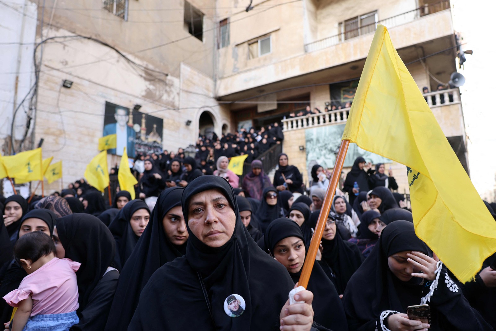 Mulher carrega bandeira do Hezbollah durante funeral de pessoas mortas durante explosões quase simultâneas de pagers no Líbano,ocorridas no dia 17 de setembro de 2024 — Foto: Anwar AMRO / AFP